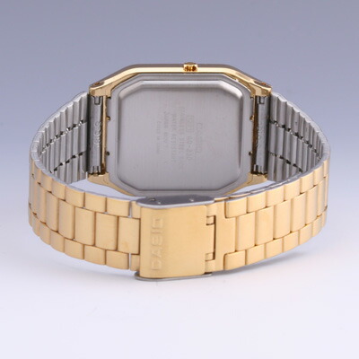 クォーツのアナログ部の下の小窓に、ストップウォッチ機能、アラーム機能、カレンダー機能(日付・曜日)を搭載したデジタル部があります。ゴールドのシンプルなデザインです。